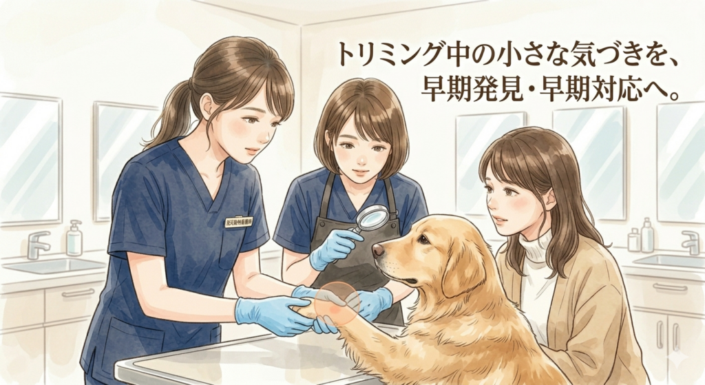 トリミング中は、わずかな体調の変化や皮膚の状態にも注意を払いながら施術を行っています。異常が認められた場合には、必要に応じて獣医師と連携し、速やかに対応できる体制を整えています。